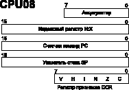 Центральный процессор МК семейства HC08 (далее CPU08) выполняет действия над 8-разрядными операндами. Программная модель CPU08 (рис. 3) содержит 5 регистров, которые не являются частью объединённого адресного пространства, и, следовательно, для обращения к ним используются специальные команды: